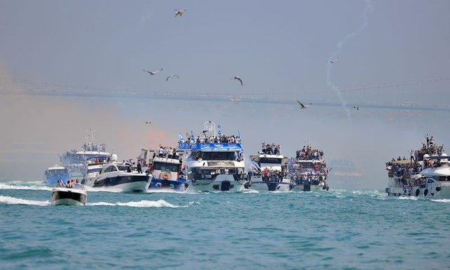 Buradan teknelere binen siyah-beyazlı oyunculara taraftarlar da başka teknelerle eşlik etti.