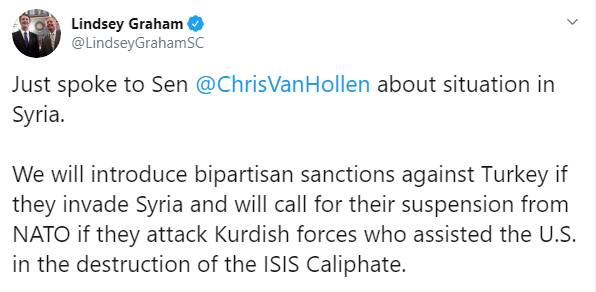 “Demokrat Senatör Chris Van Hollen ile şimdi Suriye’deki durum hakkında konuştum. Suriye’ye girmesi halinde Türkiye’ye iki parti olarak yaptırımları getireceğiz ve IŞİD halifeliğinin yıkılmasında ABD’ye yardım eden Kürt güçlerine saldırmaları durumunda da Türkiye’nin NATO üyeliğinin askıya alınması çağrısı yapacağız. Türkiye’ye karşı yaptırımların veto edilmemesini umuyor ve bekliyoruz.”