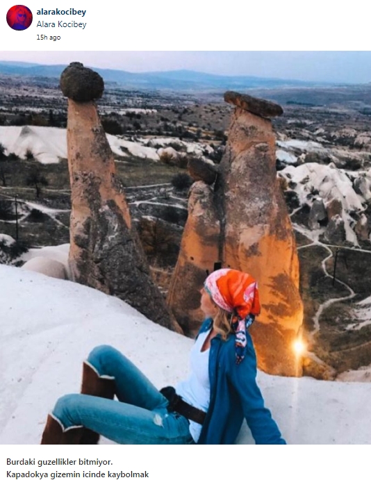 Takvim Gazetesi’nin haberine göre Koçibey, Peri Bacaları’nı gezdi. Tatilden çektiği fotoğrafları ve videoları sosyal medyada paylaşan Alara Koçibey, “Rüyada gibiyim” dedi.