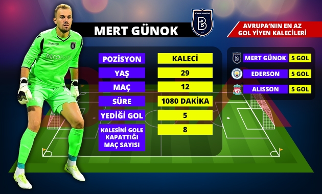 Geçen sezon transfer olduğu Medipol Başakşehir’de 4 lig ve 4 kupa maçına çıkan Günok, kaleyi devraldığı bu sezonda takımıyla 12 mücadeleye çıktı ve 8 maçta gol yemedi. Mert Günok’un etkili performansıyla sadece 5 golü kalesinde gören Başakşehir’e bu alanda en yakın takım olan Evkur Yeni Malatyaspor ise 10 gole engel olamadı.