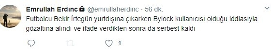 ATV haber muhabiri Emrullah Erdinç twitter hesabından yaptığı paylaşımda “Futbolcu Bekir İrtegün yurtdışına çıkarken Bylock kullanıcısı olduğu iddiasıyla gözaltına alındı ve ifade verdikten sonra da serbest kaldı” ifadelerini kullandı.
