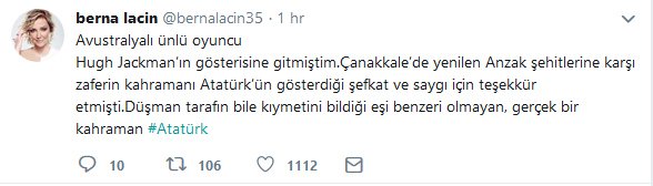 Jackman’ın bir gösterisini izlediğini ve bu gösteride başarılı oyuncunun Atatürk hakkında söyledikleriyle gururlandığını söyleyen Laçin şunları yazdı: