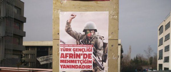 “Türk gençliği Afrin’de Mehmetçik’in yanındadır” yazılı afişlerde; tanklar ve Türk askerinin fotoğrafları kullanıldı.
