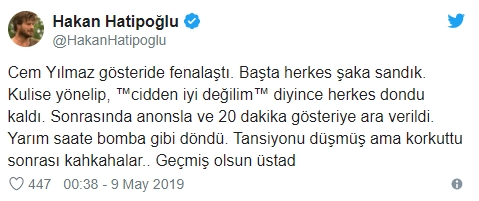 “Cem Yılmaz gösteride fenalaştı. Başta herkes şaka sandık. Kulise yönelip, “Cidden iyi değilim” deyince herkes dondu kaldı. Sonrasında anonsla ve 20 dakika gösteriye ara verildi. Yarım saate bomba gibi döndü. Tansiyonu düşmüş ama korkuttu sonrası kahkahalar.. Geçmiş olsun üstad”