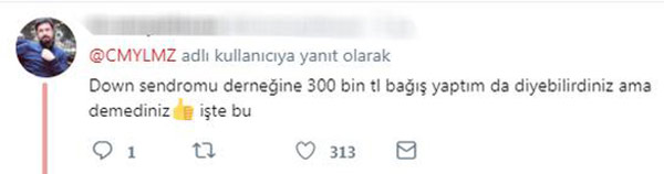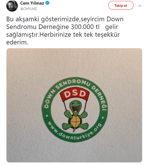 Başarılı komedyen, gösterisinin geliriyle bağışta bulunduğunu belirterek, “Bu akşamki gösterimizde, seyircim Down Sendromu Derneği’ne 300 bin TL gelir sağlamıştır. Her birinize tek tek teşekkür ederim” ifadelerini kullandı.