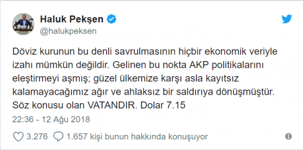 CHP Trabzon Milletvekili Haluk Pekşen, Twitter hesabından yaptığı açıklamada “Döviz kurunun bu denli savrulmasının hiçbir ekonomik veriyle izahı mümkün değildir. Gelinen bu nokta AKP politikalarını eleştirmeyi aşmış; güzel ülkemize karşı asla kayıtsız kalamayacağımız ağır ve ahlaksız bir saldırıya dönüşmüştür. Söz konusu olan VATANDIR. Dolar 7.15” ifadelerini kullandı.