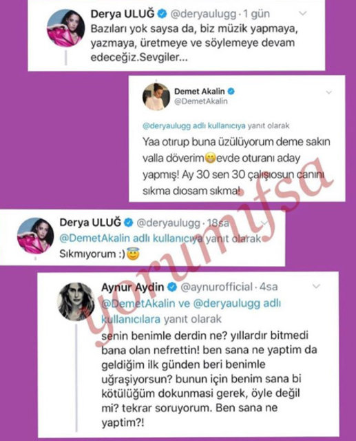 Habertürk’ün haberine göre bir radyo kanalının düzenlediği ödül töreninde aday gösterilmeyen Derya Uluğ, twitter hesabından “Bazıları yok saysa da, biz müzik yapmaya, yazmaya, üretmeye ve söylemeye devam edeceğiz” mesajını paylaştı.