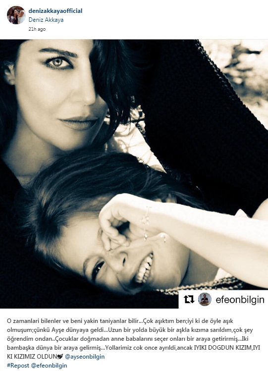 Sözcü Gazetesi’nin haberine göre kızının babası Efe Önbilgin’in bir paylaşımını kendi hesabına taşıyan eski manken Deniz Akkaya sosyal medya hesabından yaptığı paylaşım üzerinden kızı Ayşe’nin doğum gününü kutladı. Her ne kadar kızının babasıyla yollarını ayırmış olsa da Akkaya yaptığı paylaşımda ona da birkaç söz söylemeyi ihmal etmedi.