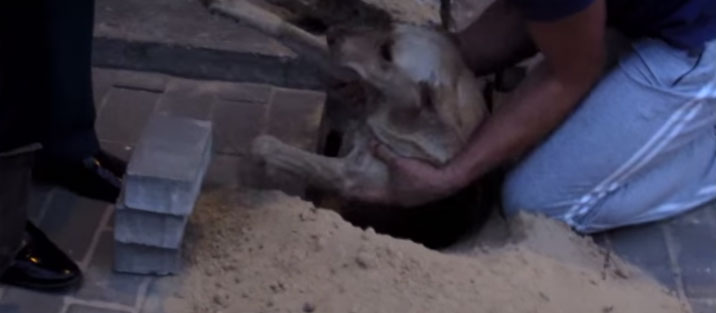 Apartman yetkililerinin konuyla ilgilenmeyeceği ortaya çıkınca Radim Vustam köpeği kendisi kurtarmaya karar verdi. Elindeki gereçlerle kaldırımı oluşturan tuğlaların birkaç tanesini söken adam, köpeğin yolunu kapatan büyük bir kaya parçasıyla karşılaştı.