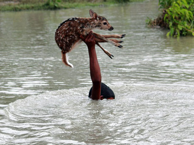 Çocuk sağ salim kıyıya çıkarken, hayatını riske ederek tümüyle sular içindeyken geyik yavrusunu elinin üzerinde taşıdığı fotoğraf, insanlık adına bir abide olarak zihinlerde yer etti.