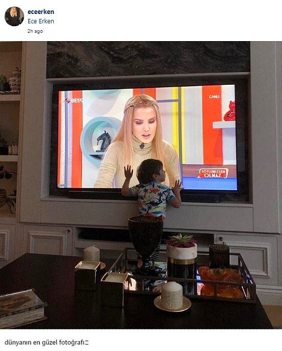 Ece Erken kendisini ekrandan izleyen Eymen’in televizyona sarıldığı anda çekilen fotoğrafını sosyal medya hesabından “Dünyanın en güzel fotoğrafı” notuyla yayınladı.