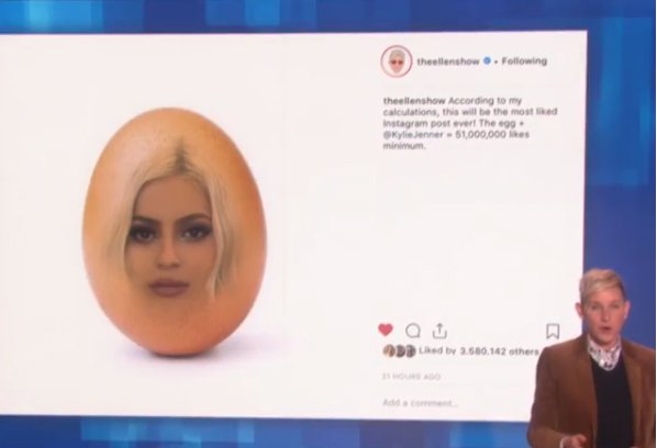 Konu böylesine önemli bir noktaya gelince Ellen DeGeneres kendisine yakışanı yaptı ve yumurtanın üzerine Kylie’nin yüzünü ekleyerek seyircilerinin karşısına çıktı. Ellen esprili bir şekilde sunduğu bu girişimi ile ikisinin toplamı bir beğeni almayı umduğunu da belirtmeden geçemedi.