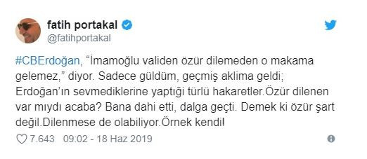 “CB Erdoğan, ‘İmamoğlu validen özür dilemeden o makama gelemez’ diyor. Sadece güldüm, geçmiş aklıma geldi; Erdoğan’ın sevmediklerine yaptığı türlü hakaretler. Özür dilenen var mıydı acaba? Bana dahi etti, dalga geçti. Demek ki özür şart değil. Dilenmese de olabiliyor. Örnek kendi!”