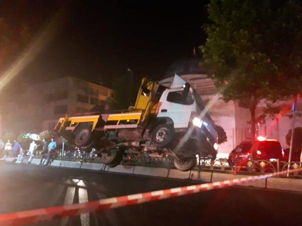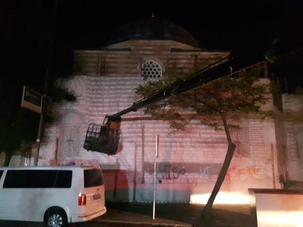 Fatih'te gece saatlerinde bayrak asma çalışması yapan vinç, henüz bilinmeyen bir nedenle devrilerek askıda kaldı. Devrilen vinç iki kepçenin çalışması sonucu yaklaşık 1.5 saat sonra kurtarıldı.