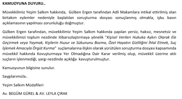 Yeşim Salkım’ın avukatından konuya ilişkin açıklama şu şekilde: