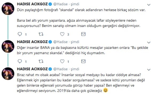 Takipçileri tarafından saygısızlıkla suçlanan Hadise sessizliğini bozdu ve twitter hesabından yaptığı bir dizi paylaşımla bu hareketi yapmasının ardındaki nedeni açıkladı: