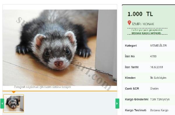 “İkisi de bir yaşına yakın, gayet evcil, cana yakın hayvanlar. Kedi köpeğe alışıklar, ev içinde serbest yaşıyorlar. Bir hafta önce çiftleştiler, dişi büyük ihtimalle hamile. Ayrı ayrı vermiyorum. İkisini birlikte alana fiyatım 2 bin lira’, ‘Satılık feret yavruları’, ‘Isırma huyu kesinlikle olmayan feret tamamen evcildir. Büyük kafesiyle birlikte vereceğim. İstanbul detaylı bilgi için WhatsApp.”