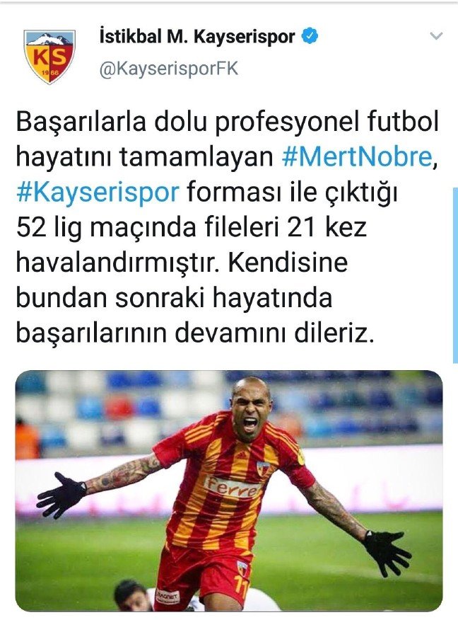 İstikbal Mobilya Kayserispor resmi sayfasında yayınlanan mesajda; “Başarılarla dolu profesyonel futbol hayatını tamamlayan Mert Nobre, Kayserispor forması ile çıktığı 52 lig maçında fileleri 21 kez havalandırmıştır. Kendisine bundan sonraki hayatında başarılarının devamını dileriz” denildi.