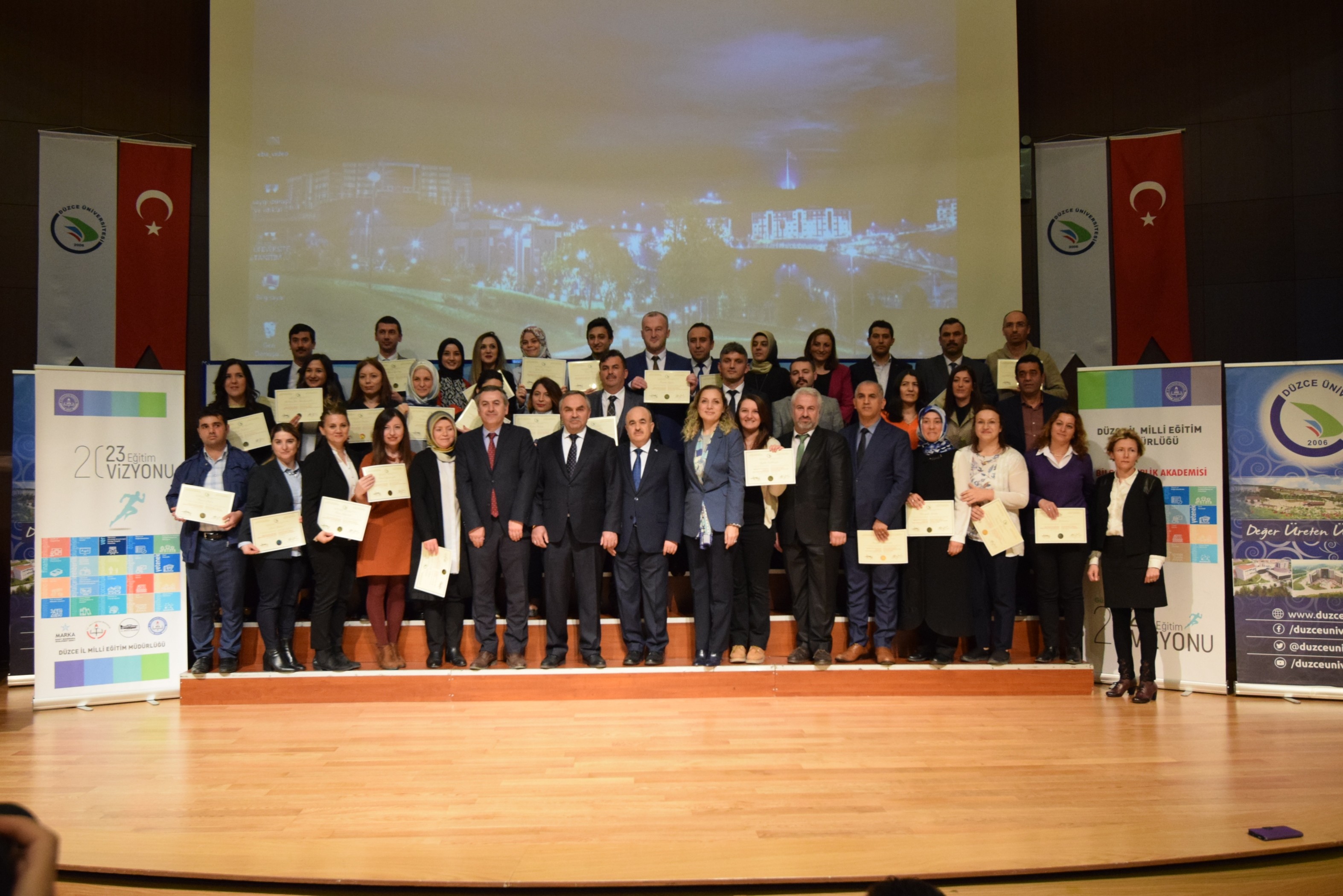 Düzce Üniversitesi ile Düzce İl Milli Eğitim Müdürlüğü arasında 2017 yılında imzalanan iş birliği protokolü kapsamında Düzce Üniversitesi Enstitülerinde lisansüstü eğitimlerini başarı ile tamamlayan Milli Eğitim Müdürlüğü bünyesindeki okul yöneticilerine ve öğretmenlere diplomaları yapılan törenle takdim edildi.