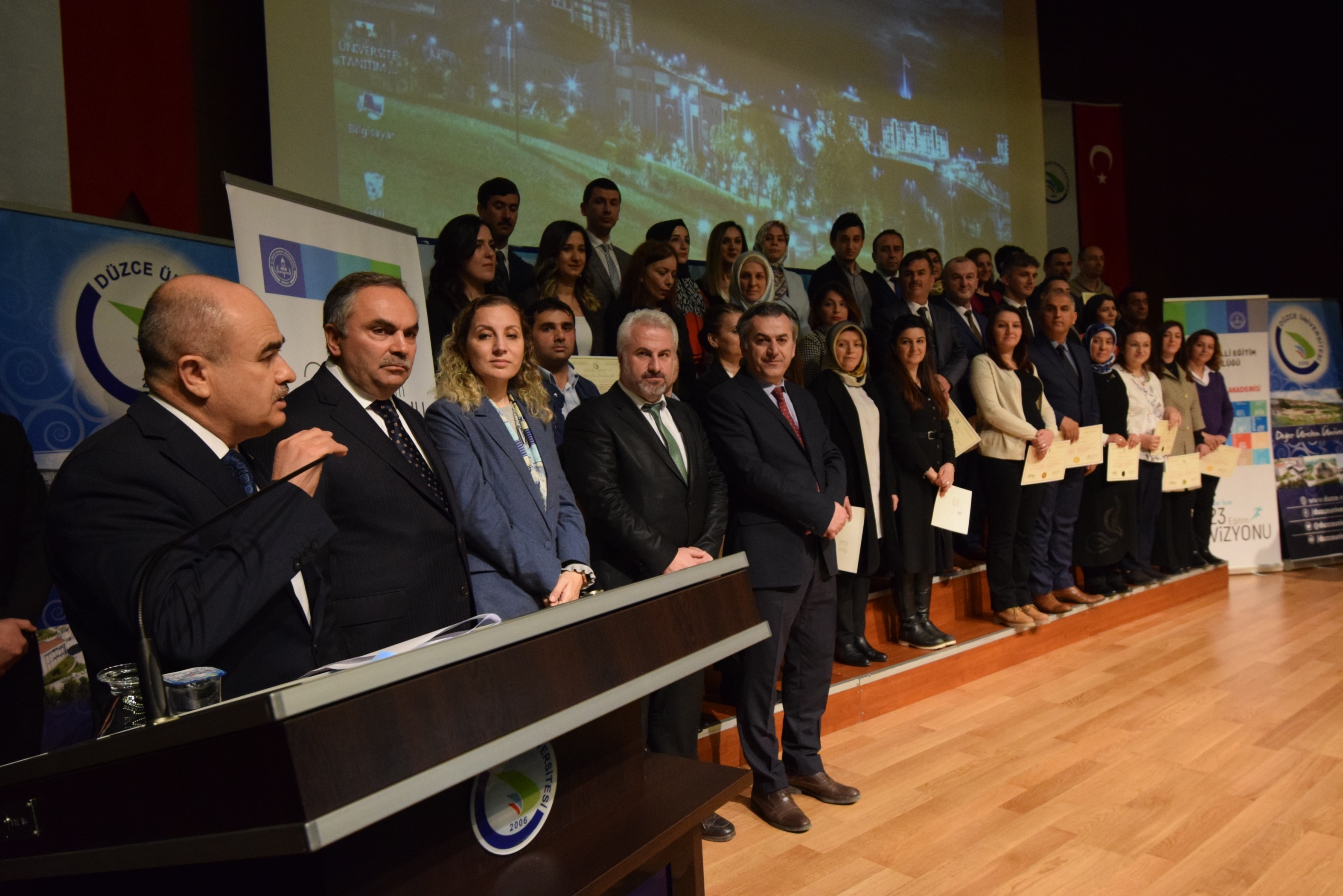 Törende, yüksek lisans eğitimlerini başarıyla tamamlayan öğretmenlere diplomaları, Düzce Valisi Dr. Zülkif Dağlı, Düzce Belediye Başkanı Dursun Ay, Düzce Üniversitesi Rektörü Prof. Dr. Nigar Demircan Çakar, İl Milli Eğitim Müdürü Murat Yiğit ve Düzce Üniversitesi Sosyal Bilimler Enstitüsü Müdürü Doç. Dr. Ali Ertuğrul tarafından takdim edildi. Diploma takdim töreni sonrasında konuşan Düzce Valisi Dr. Zülkif Dağlı, 1.5 yıl önce protokol imzalamak suretiyle bu çalışmayı başlattıklarını ifade ederek öğretmenleri kutladı. 37 öğretmenin yüksek lisans eğitimini tamamladığını belirten Vali Dağlı, şu anda 40 öğretmenin de lisans üstü eğitime devam ettiğini söyleyerek bu tablodan mutluluk duyduklarını sözlerine ekledi.