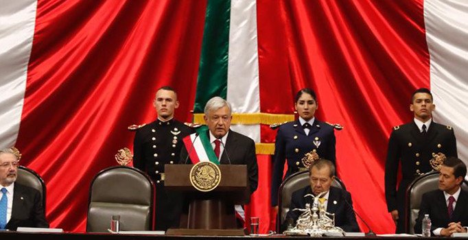 Meclis Başkanı Porfirio Munoz Ledo’nun, görev süresi dolan Devlet Başkanı Enrique Pena Nieto’dan teslim aldığı devlet başkanlığı kuşağını sağ omzundan çapraz olarak asan Obrador, yemin ederek resmen göreve başlamış oldu.