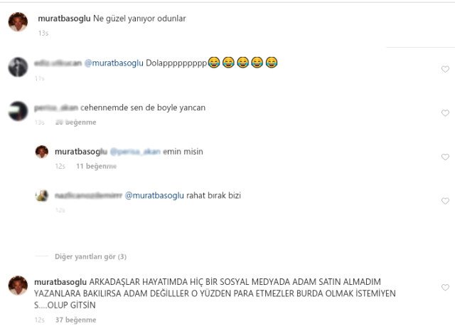 Sözcü Gazetesi’nin haberine göre 1.5 yıl önce Bodrum’daki bir teknede yeğeni Burcu Başoğlu ile özel görüntüleri çıkan ve zor günler geçiren Murat Başoğlu, sosyal medya sayfasından kendisine olumsuz yorum yapan takipçilerine küfür ederek karşılık verdi.