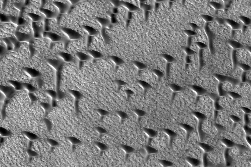 Kızıl gezegendeki kum tepeciklerini görüntüleyen bilim insanları T ve V harflerine benzeyen yapıları yakından inceliyor.