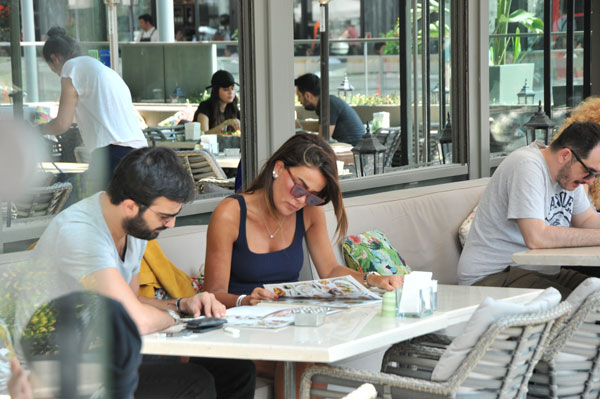 Bronz teniyle dikkat çeken çift, çevredeki meraklı bakışlara aldırış etmeden yemek yiyip, sohbet etti. İkili, uzun süre sonra AVM’den ayrıldı.
