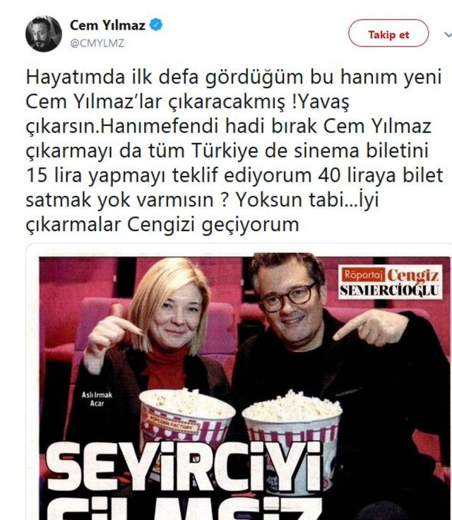 Yavaş çıkarsın. Hanımefendi hadi bırak Cem Yılmaz çıkarmayı da tüm Türkiye de sinema biletini 15 lira yapmayı teklif ediyorum 40 liraya bilet satmak yok var mısın? Yoksun tabi…İyi çıkarmalar. Cengiz’i geçiyorum.