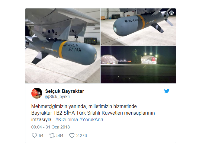 Baykar Makine Teknik Müdürü Selçuk Bayraktar, kişisel sosyal medya hesabı Twitter’dan paylaştığı Kızılelma ve Yörük Ana imzalı TB 2 SİHA fotoğraflarıyla “Mehmetçiğimizin yanında, milletimizin hizmetinde… Bayraktar TB2 SİHA Türk Silahlı Kuvvetleri mensuplarının imzasıyla…” ifadelerini paylaştı.