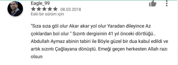 “Eyyüp K.: Elinize sağlık. Sızıntı’yla başlandı çok şükür ki Allah Çağlayan haline getirdi. Furkan G.: Sızıntı, Çağlayan oldu… Çaylıoğlu K.: Damlalar deryalaşacak, Sızıntı coşup Çağlayan olacak, elbet ışık karanlığı boğacak!”