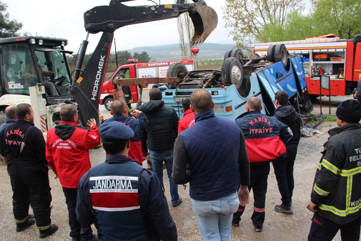 Alınan bilgilere göre, Soma-Savaştepe karayolunda Yağcıllı Mahallesi mevkisinde Sedat Y. idaresindeki tarım işçilerini taşıyan 09 PK 933 plakalı minibüs, önünde aniden duran kamyona çarpmamak için kontrolden çıkınca devrildi.