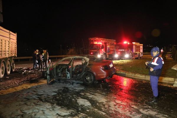 Olay, Tekkeköy ilçesinde saat 23.45’te meydana geldi. Remzi Görür yönetimindeki 37 RD 018 mermer yüklü TIR, Samsun-Ordu Karayolu Gelemen mevkisindeki kavşakta aynı yönde giden Uğur Gümüş yönetimindeki 55 ABB 891 plakalı lüks otomobille çarpıştı. Çarpmanın etkisiyle savrulan otomobil, alev alev yandı. Olay yerine itfaiye ekibi çağırıldı.