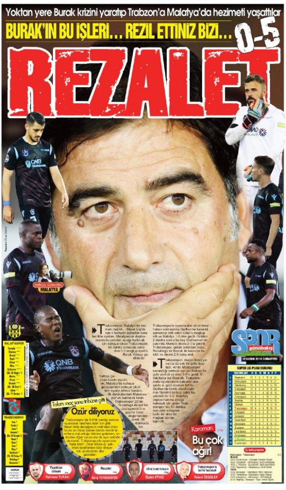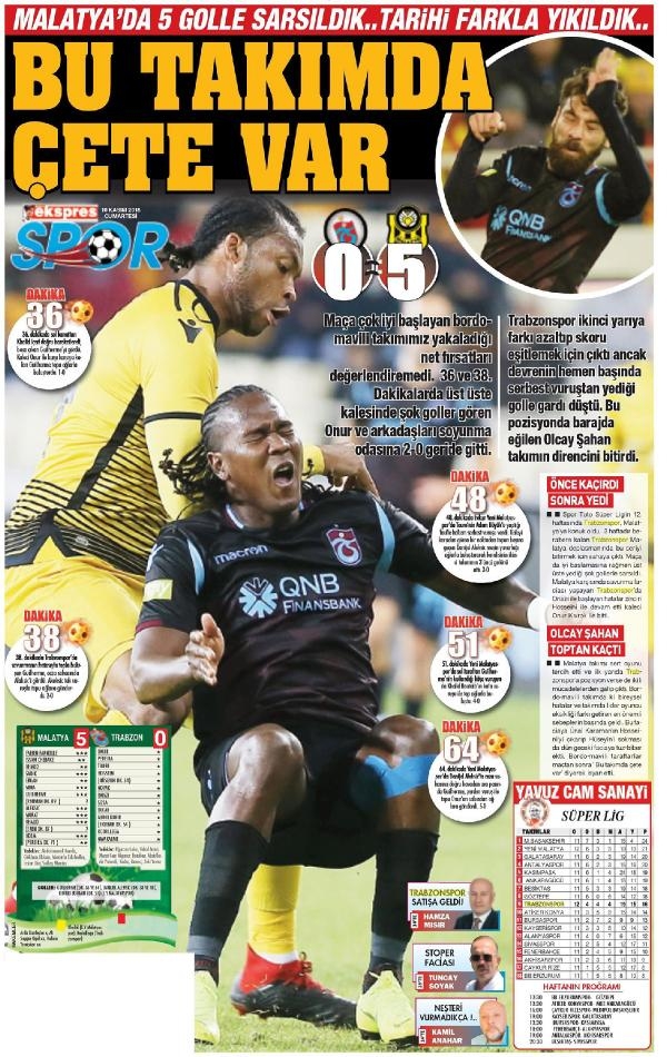 Yerel gazeteler, Trabzonspor’un deplasmanda Evkur Yeni Malatyaspor karşısında aldığı 5-0’lık farklı mağlubiyete sert tepki gösterdi. Bazı gazeteler rezalet, bazı gazeteler ise sabotaj yorumlarını yaptı.