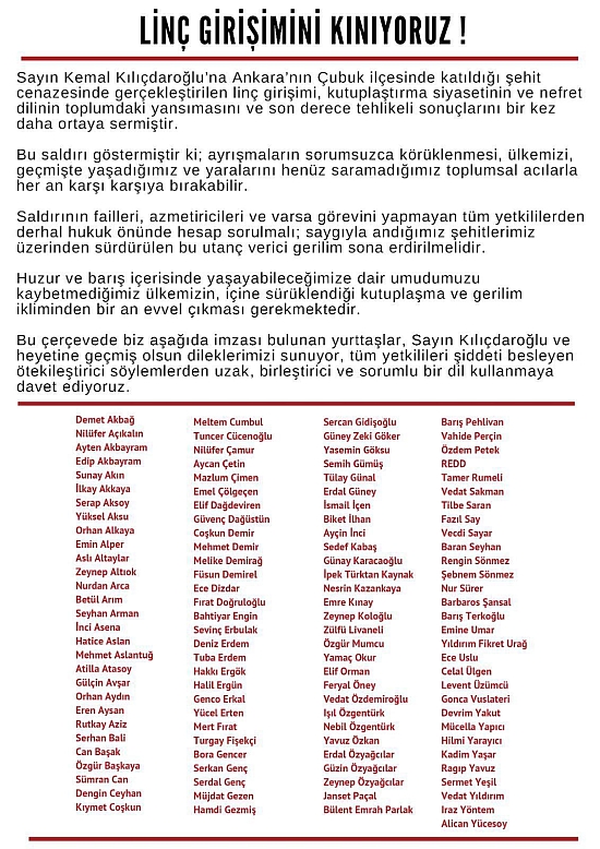 İmzacıları arasında Genco Erkal, Fazıl Say, Demet Akbağ, Mehmet Aslantuğ, Erdal Özyağcılar ve Nur Sürer gibi usta sanatçıların da olduğu kınama metninde, “Sayın Kemal Kılıçdaroğlu’na Ankara’nın Çubuk ilçesinde katıldığı şehit cenazesinde gerçekleştirilen linç girişimi, kutuplaştırma siyasetinin ve nefret dilinin toplumdaki yansımasını ve son derece tehlikeli sonuçlarını bir kez daha ortaya sermiştir” denildi.