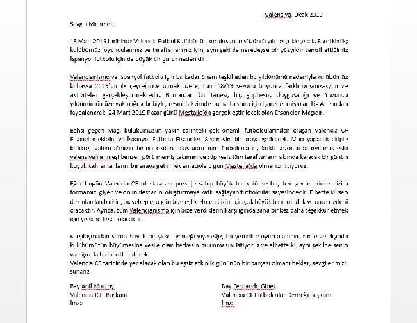 24 Mart’taki Valencia CF Efsaneler ekibini ve İspanyol Futbolu Efsaneleri seçmesini bir araya getirecek özel ve anlamlı gösteri maçı için Mehmet Topal’a gelen mektup şöyle: