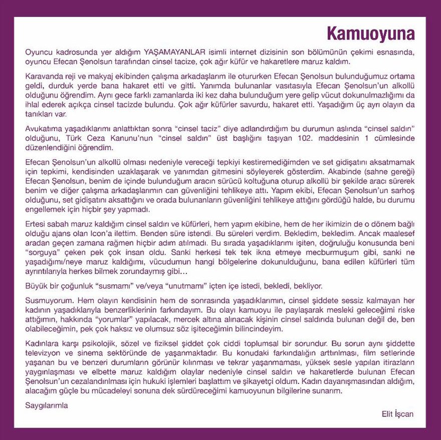 Konu ile ilgili yasal süreci başlatan Elit İşcan, sosyal medya hesabından da kamuoyuna bir duyuru yaptı. Yazısında Efecan Şenolsun’un alkollü olduğunu, kendisine hakaret ve küfür ettiğini, aynı gece 3 kez sözlü ve fiziksel tacize uğradığını belirtti.
