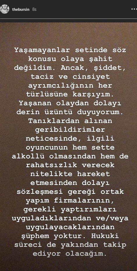 Dizinin başrol oyuncularından Kerem Bürsin de sosyal medya hesabından yaptığı paylaşımla setteki taciz iddiaları hakkında açıklamada bulunu: