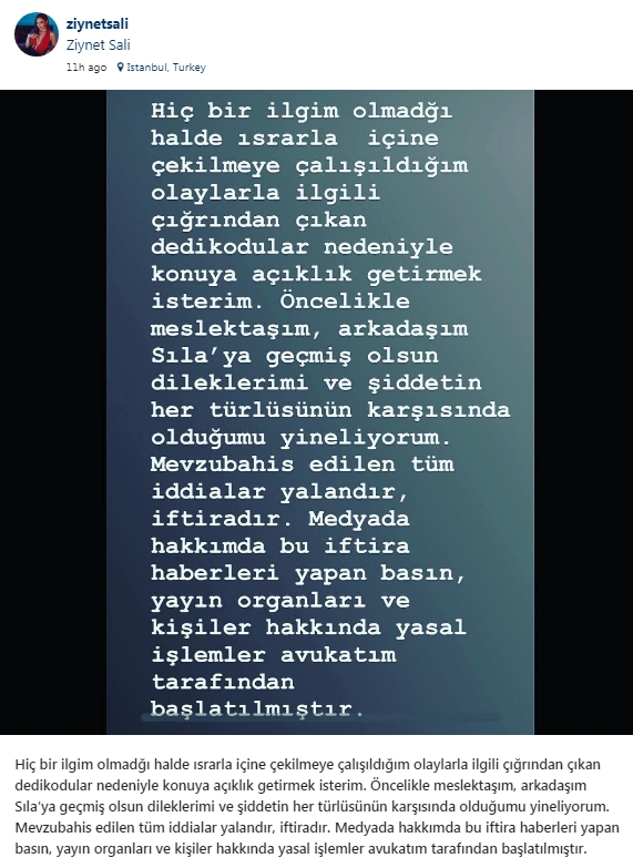 Ziynet Sali, yapılan haberleri “Hiç bir ilgim olmadığı halde ısrarla içine çekilmeye çalışıldığım olaylarla ilgili çığırından çıkan dedikodular nedeniyle konuya açıklık getirmek isterim. Öncelikle meslektaşım, arkadaşım Sıla’ya geçmiş olsun dileklerimi ve şiddetin her türlüsünün karşısında olduğumu yineliyorum. Mevzubahis edilen tüm iddialar yalandır, iftiradır. Medyada hakkımda bu iftira haberleri yapan basın, yayın organları ve kişiler hakkında yasal işlemler avukatım tarafından başlatılmıştır.” diyerek yalanladı.